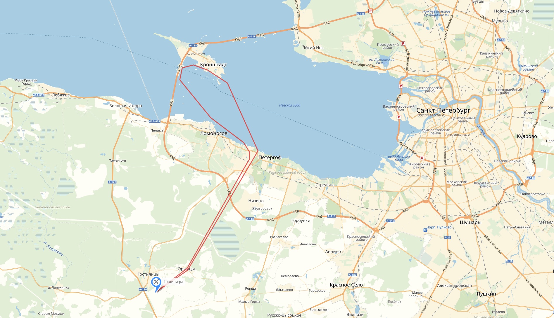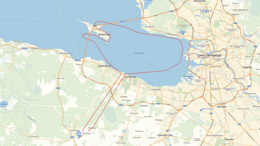 Ваше путешествие начнется с самого крупного аэродрома малой авиации - Гостилицы. Взлетев, вы возьмете курс на Петродворец, далее, насладившись красотами парков и ансамблей, пересечете Финский залив и направитель к городу Кронштадту. В течение полета пилот Вам расскажет о местности, над которой будет совершаться полет. Увидите дамбу, основные форты Кронштадта, морской собор.В течение полета исполните простой пилотаж, попробуете под руководством пилота управление железной птицей.
