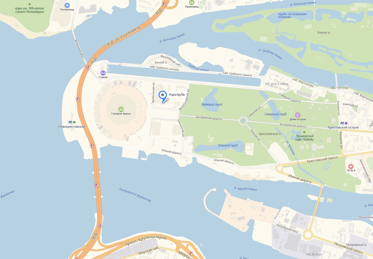 Метро Новокрестовская, Северная дорога, д. 12, рядом со стадионом Газпром-Арена.